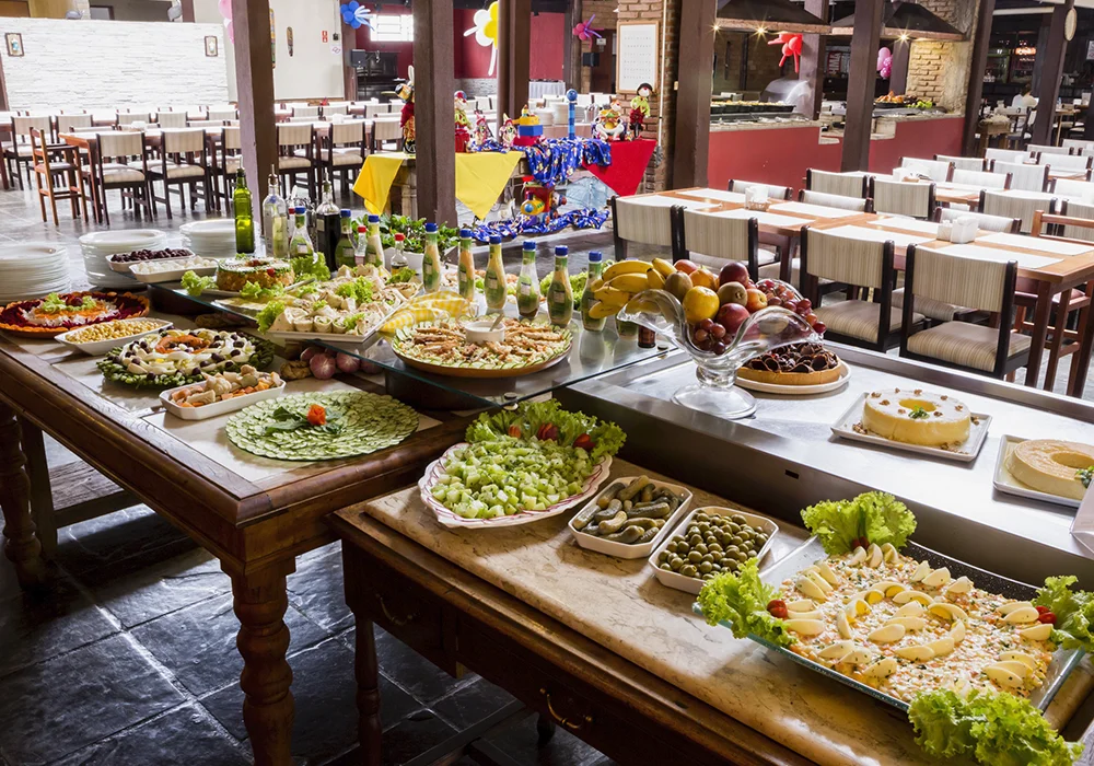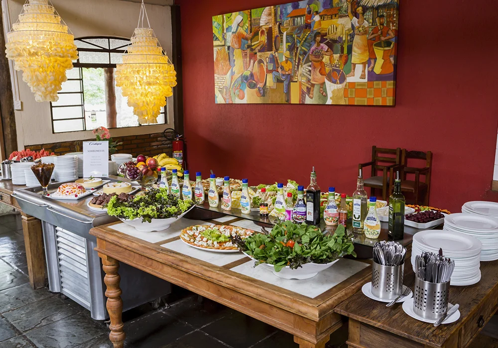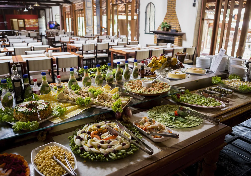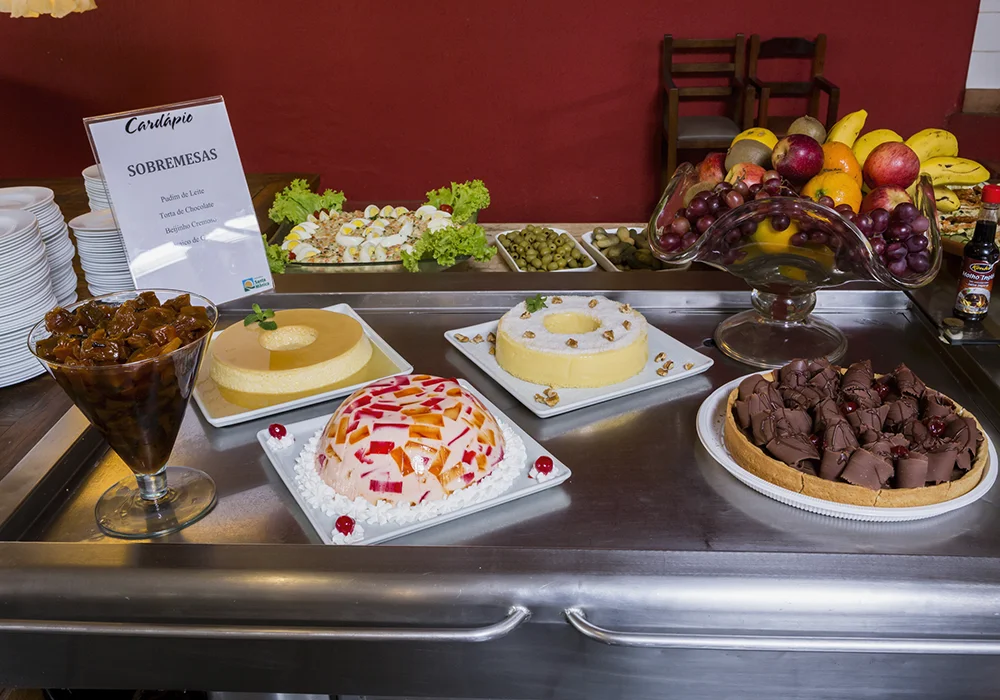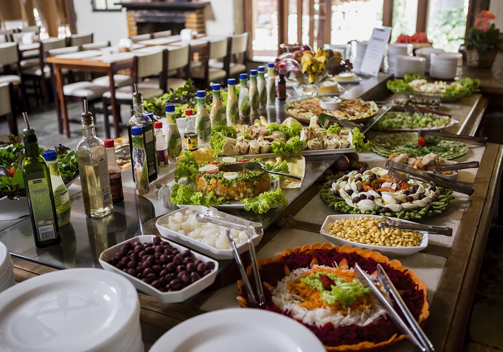 Nossos almoços e jantares variam por temporada e incluem um Cardápio do Chef com 15 tipos de saladas, 12 pratos quentes da culinária do interior e internacionais, e 5 sobremesas, incluindo doces caseiros e frutas da estação, sem esquecer do nosso tradicional pudim de leite condensado.