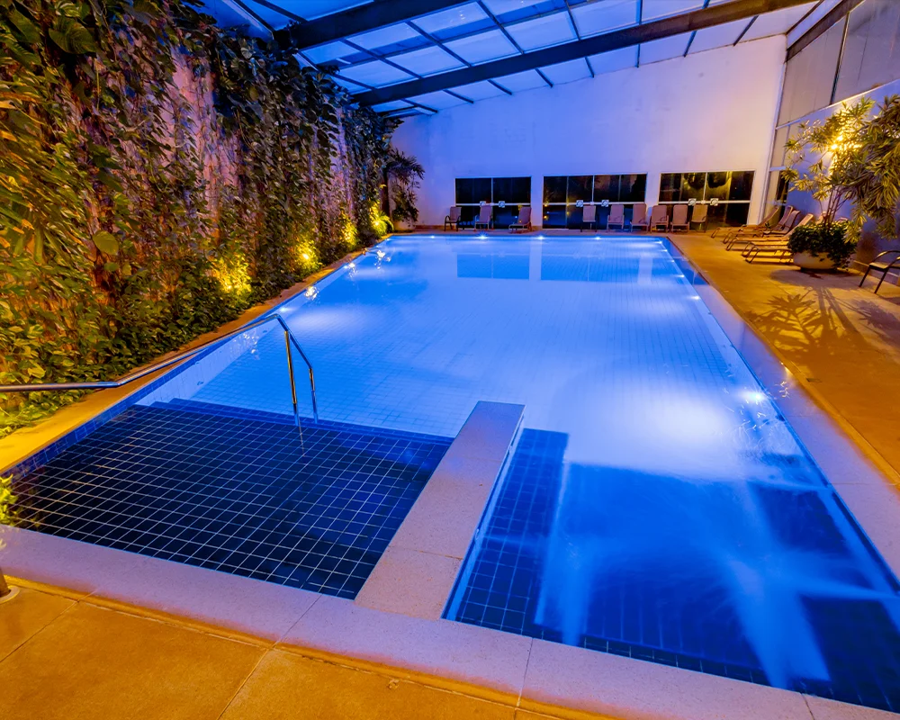 A nova piscina coberta e aquecida, tem hidromassagem e está à disposição dos hóspedes do hotel. Com mais de 15 metros de comprimento, tem profundidade de 1,05 m. Um ambiente aconchegante, climatizado e tranquilo para curtir os dias mais frios. Venha se aquecer com a gente.