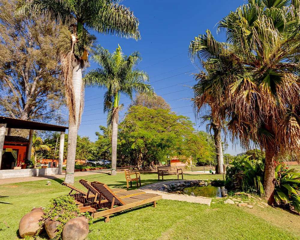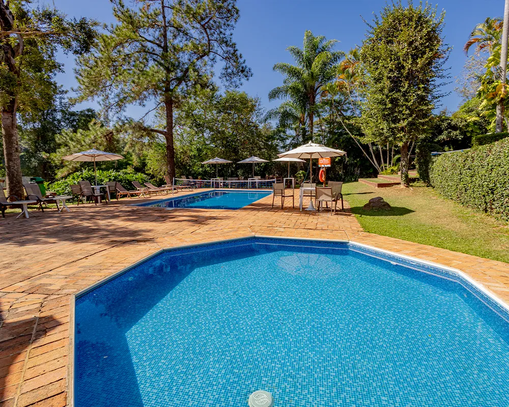 Os hóspedes circulam por passarelas calçadas, cobertas e iluminadas, apreciando os jardins, gramados e árvores seculares. Flamboyants, Ipês e Eucaliptos centenários estão presentes em toda sua estrutura.